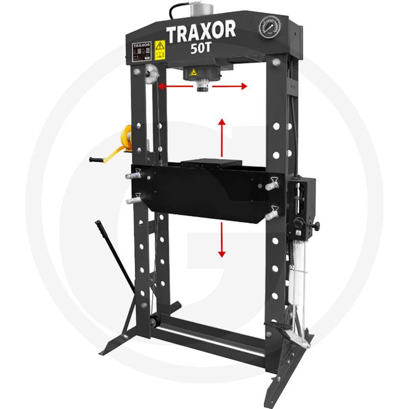 TRAXOR WP 50 HFH ir profesionāla 50 tonnu darbnīcas hidrauliskā prese, kas paredzēta presēšanas, iztaisnošanas, montāžas un demontāžas darbiem. Pateicoties hidrauliskajam cilindram ar manometru un regulējamam darba galdam, tā nodrošina precīzu un drošu darbību dažādos tehniskos pielietojumos. Cilindru iespējams pārvietot sāniski ar vārpstas mehānismu, bet presi darbināt gan ar roku, gan ar kājas sviru, kas nodrošina lielāku kontroli un ērtību.